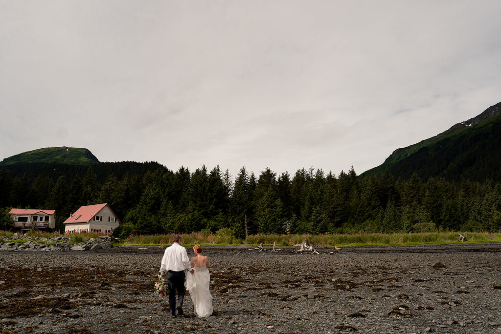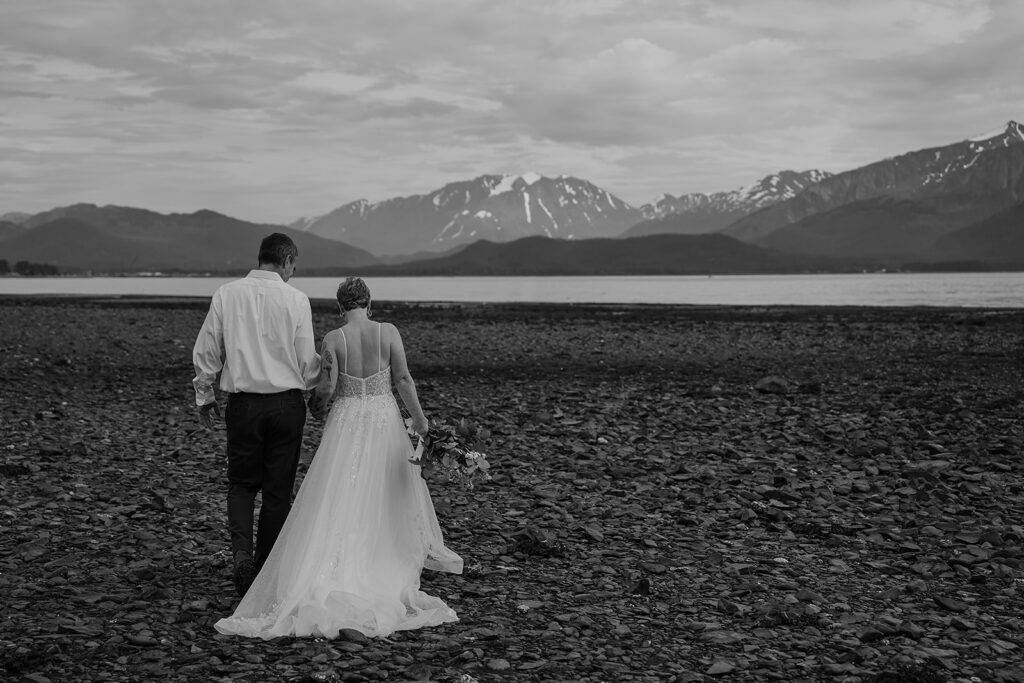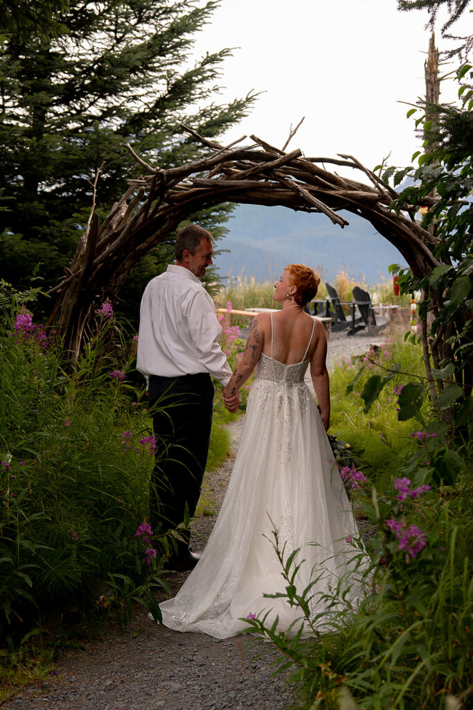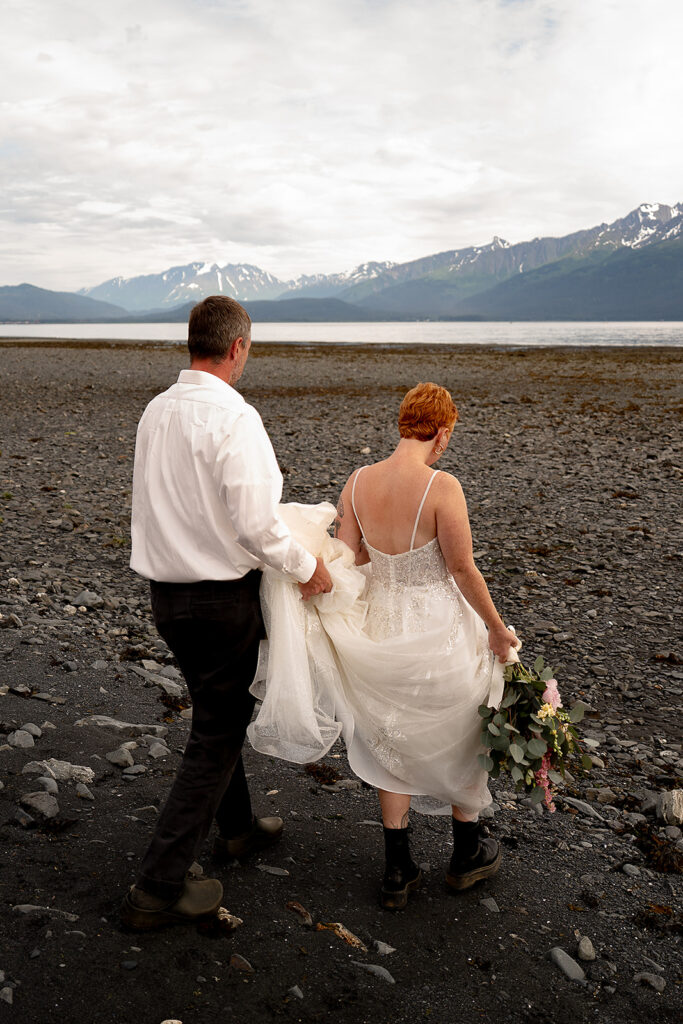 H slipped into her gown from Orainda’s Bridal, and T helped with her boots. Boots with a wedding dress in Alaska is the epitome of practicality and peak romance. Once they were ready, they stepped out into the misty forest, following Salted Roots’ winding little trail under arching driftwood and fireweed flowers. The trees opened up to the rocky shoreline, mountains in the backdrop.