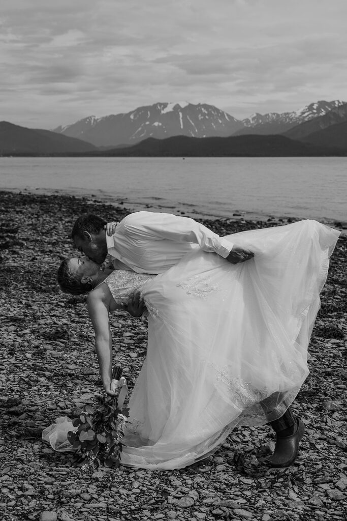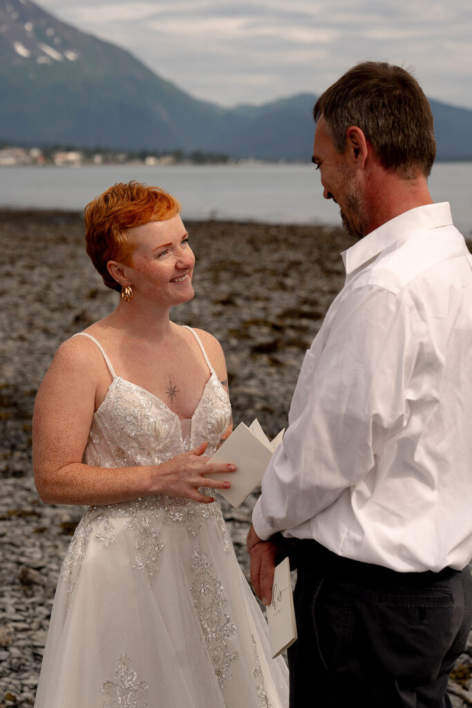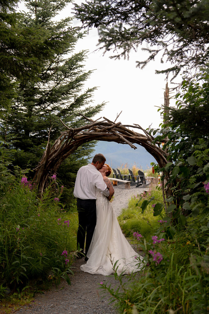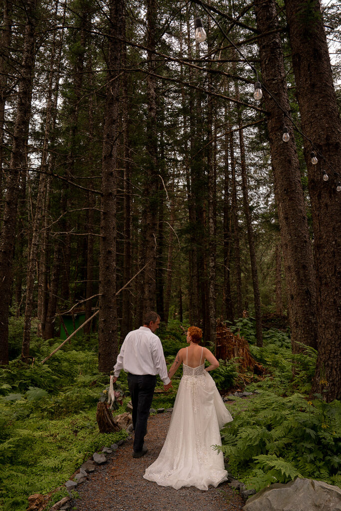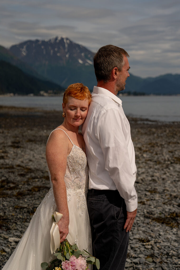 H slipped into her gown from Orainda’s Bridal, and T helped with her boots. Boots with a wedding dress in Alaska is the epitome of practicality and peak romance. Once they were ready, they stepped out into the misty forest, following Salted Roots’ winding little trail under arching driftwood and fireweed flowers. The trees opened up to the rocky shoreline, mountains in the backdrop.