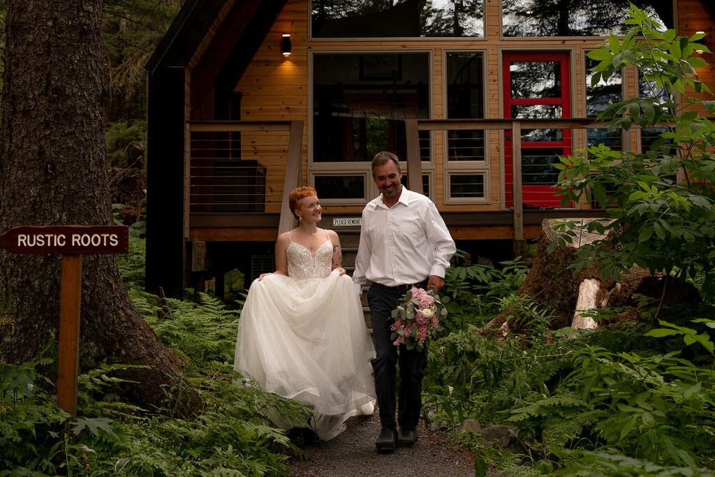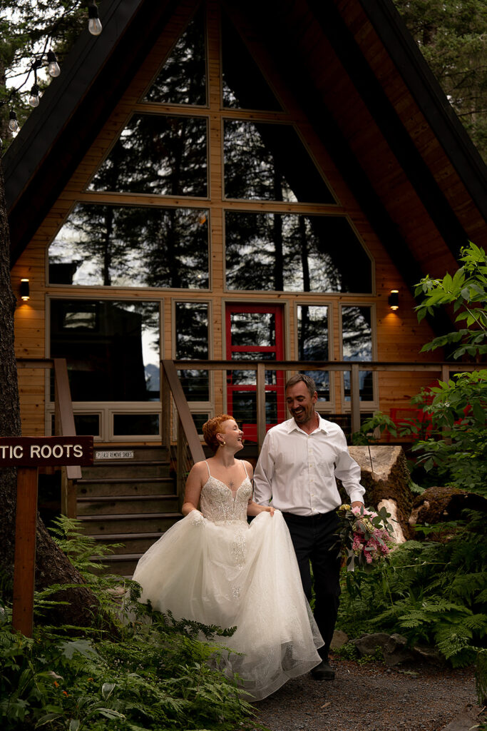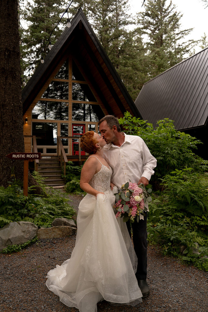 It was a calm, overcast morning at Salted Roots Cabins, the perfect setting for H+T to start their Alaska elopement day. They eased into their day slowly, intentionally, and completely together. The light drifted in through the cabin windows while they completed their pre-ceremony routine.