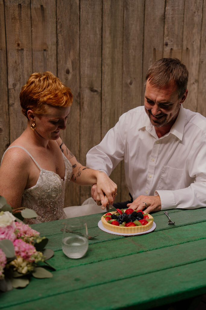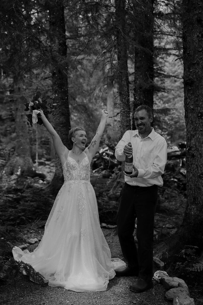 From there, we headed up the hill to the fireweed fields. Once we made our way back to the cabin, it was time for celebration. They popped a bottle in the woods—sparkling water, but with the chaos and enthusiasm of champagne. Then they cut into a small fruit tart. Alaska makes an elopement feel like a real adventure, even in the quiet moments.
